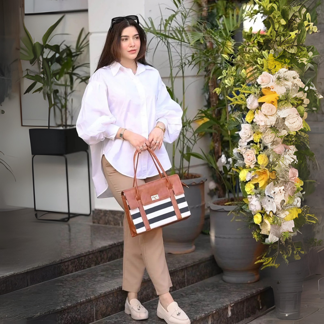 Structure: Spacious black tote for carrying laptop, books, wallet, and more. Occasions: Great for work, travel, shopping, or gifting on birthdays and Eid. Material: Premium faux leather with durable black-and-white chevron canvas.