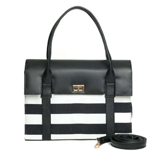 Structure: Stylish tote bag with bold black-and-white stripes, gold-tone clasp, and detachable strap.