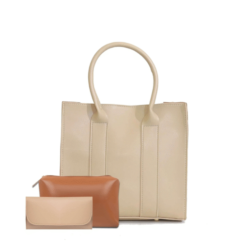 Structure: Stylish 3-piece beige set featuring tote, pouch, and wallet.
