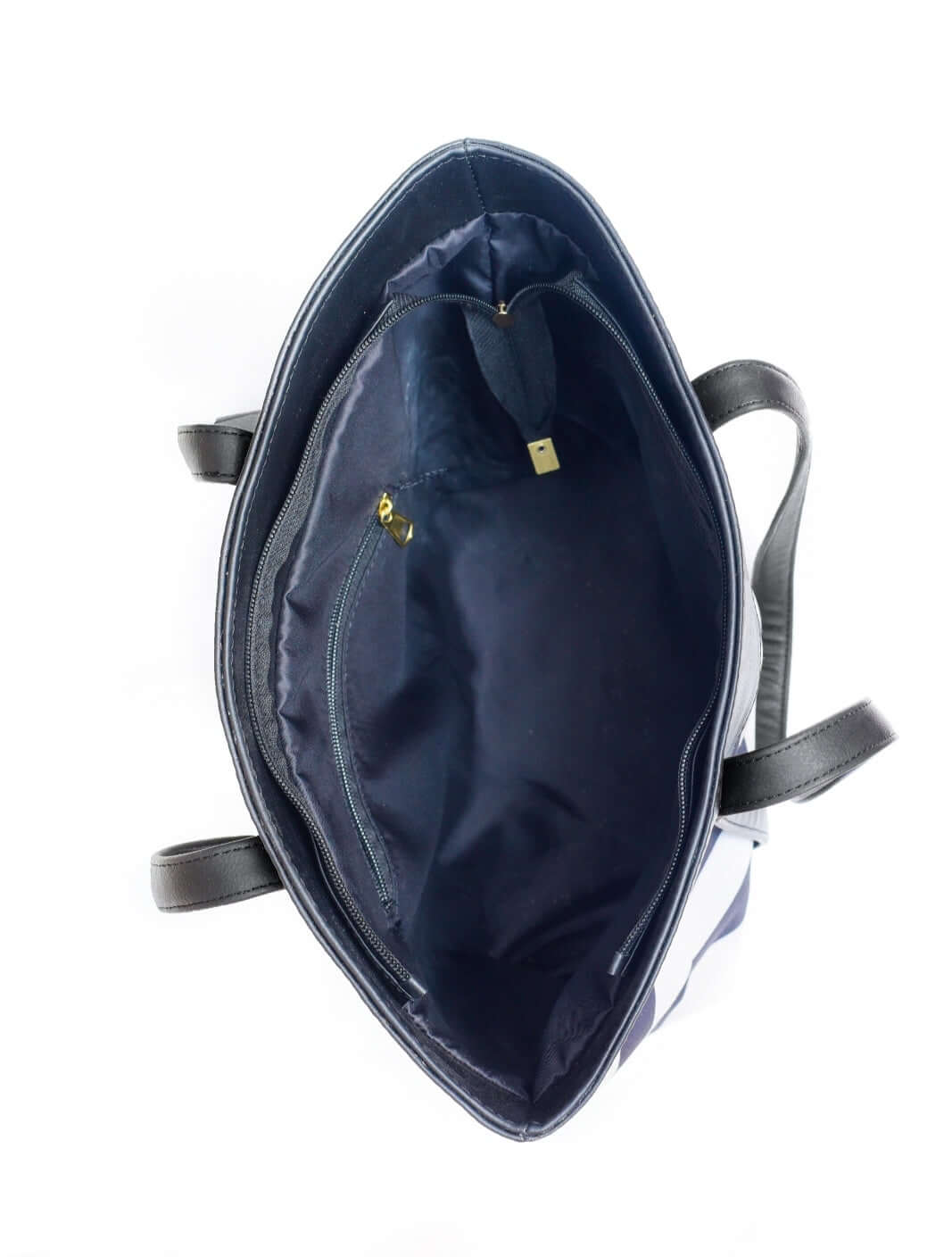 Structure: Spacious tote bag with dual top handles and a secure central zip compartment for organized storage.