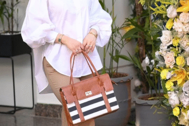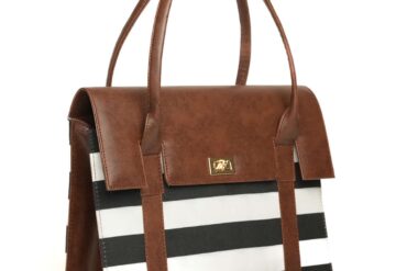 Add a touch of sophistication to your everyday style with the DARVIN BROWN tote. This structured bag combines timeless black-and-white stripes with warm brown faux leather for a striking contrast. The design features sturdy top handles, a detachable shoulder strap for versatile wear, and a secure gold-tone clasp closure. Spacious yet elegant, it’s ideal for carrying all your essentials, whether you’re heading to the office, running errands, or enjoying a weekend getaway.