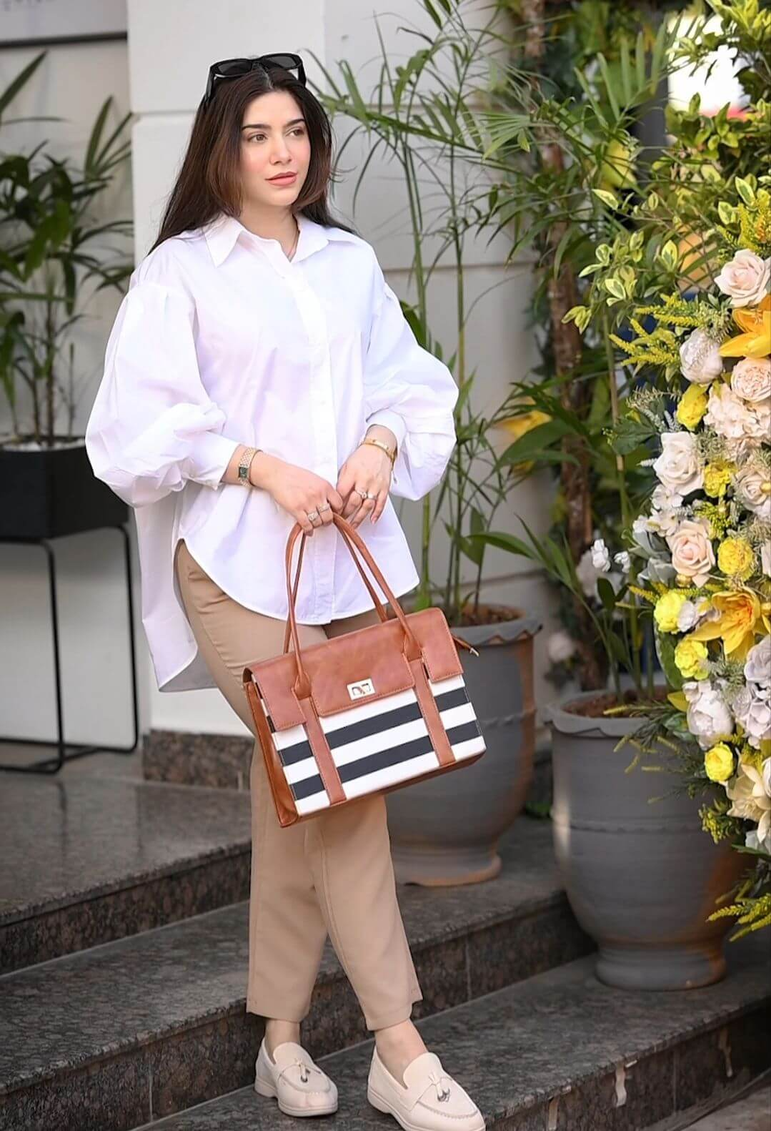 Structure: Spacious black tote for carrying laptop, books, wallet, and more. Occasions: Great for work, travel, shopping, or gifting on birthdays and Eid. Material: Premium faux leather with durable black-and-white chevron canvas.