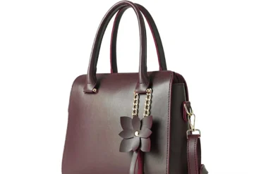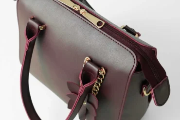 Elegant maroon handbag with floral charm, top-handle design, detachable adjustable strap, and spacious interior featuring a secure zippered pocket