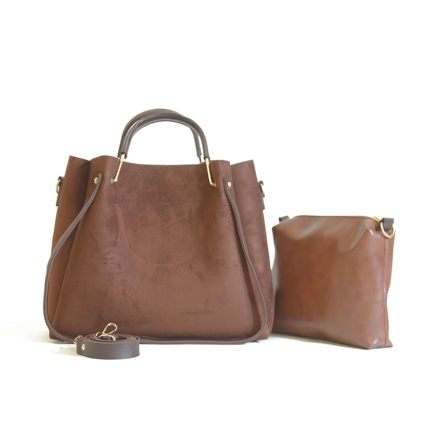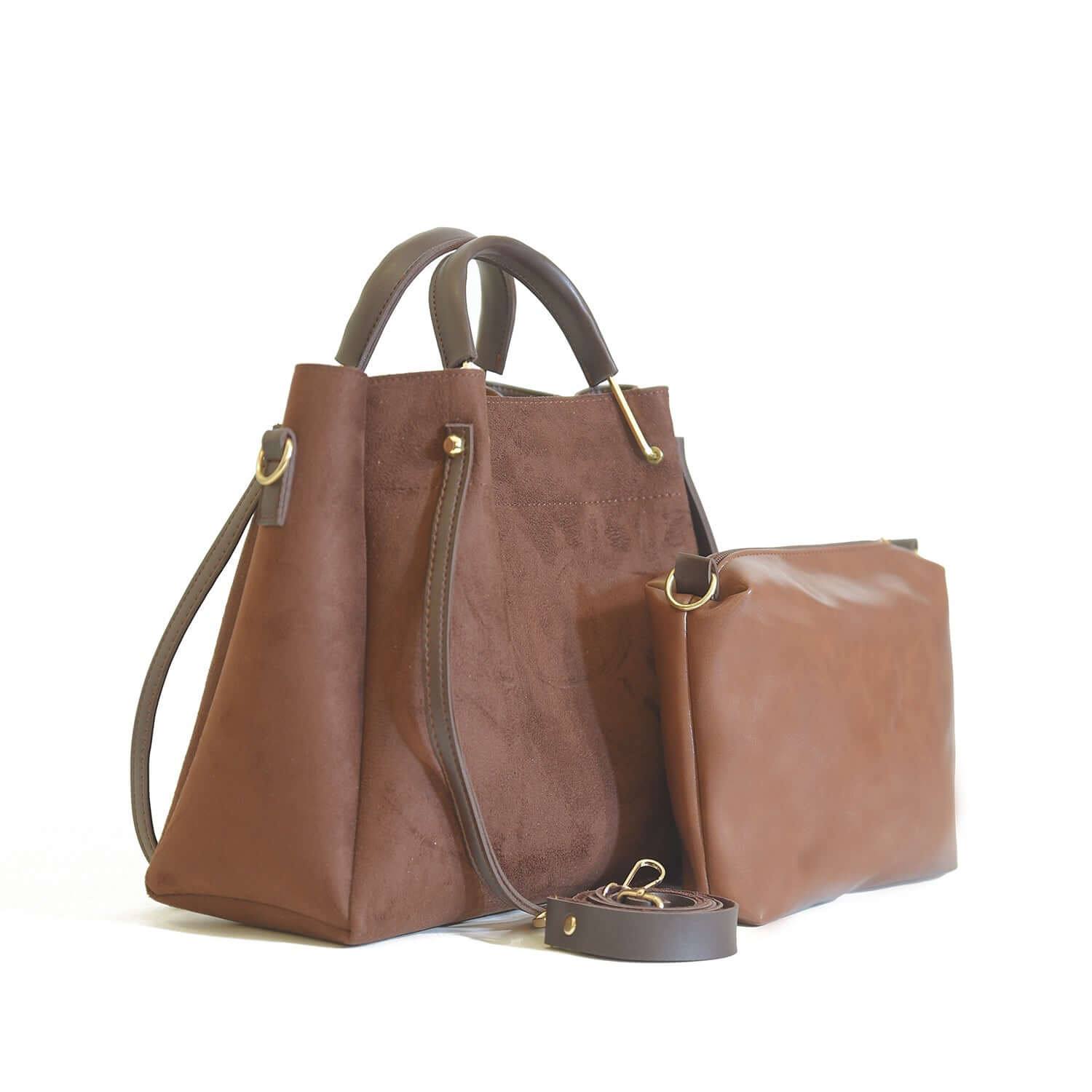Elevate your style with the GEORGIA SUEDE BROWN—a luxurious tote bag designed for elegance and versatility. Crafted from high-quality faux suede combined with leather accents, this sophisticated bag features a structured silhouette, sturdy top handles, and a detachable shoulder strap for multiple styling options. The set includes a matching pouch for added functionality, keeping your essentials organized on the go. Adorned with gold-tone hardware, this tote effortlessly transitions from workdays to weekends, making it a timeless addition to your wardrobe.