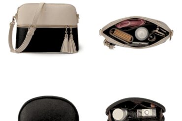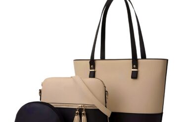 Structure: Elegant 3-piece beige and black set with tote, crossbody, and pouch.